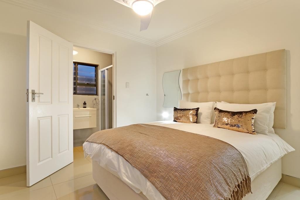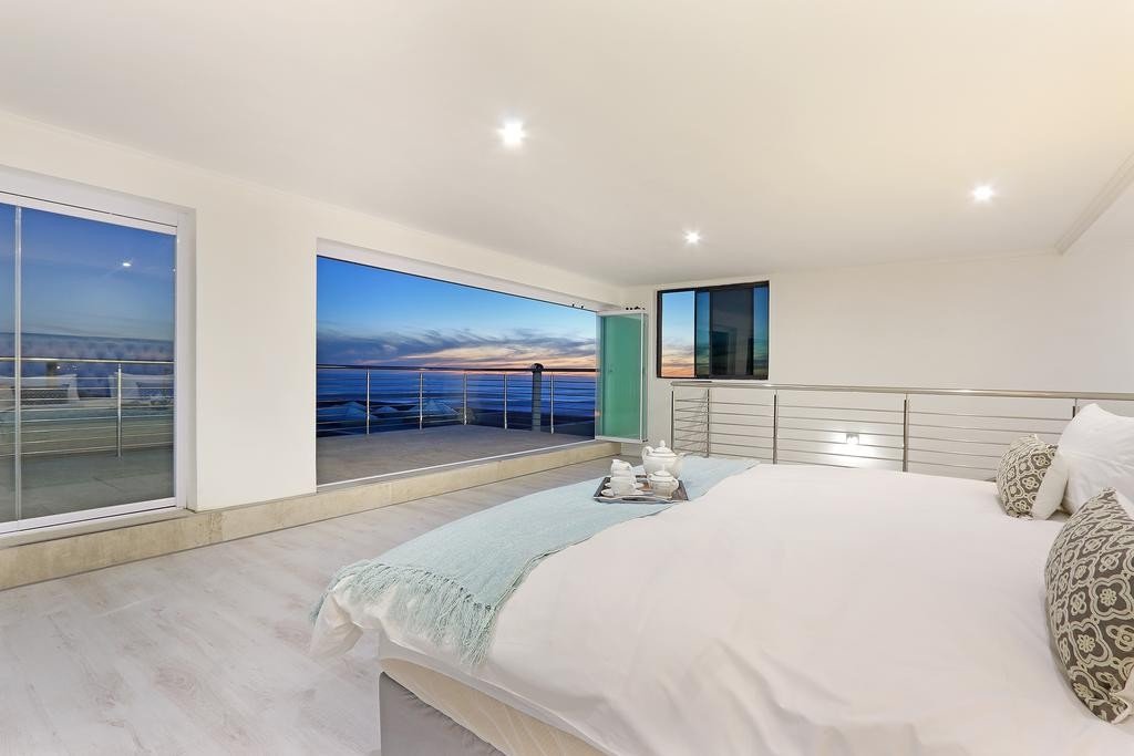 This villa is decorated beautifully in neutral shades with lovely splashes of blue to compliment the seaside setting. A dynamic main kitchen is located on the ground floor, equipped with top of the range appliances and a gas stove with a separate scullery area. Guests can enjoy the spacious and closed-off outside space that is ideal for social braai’s or outdoor dining. There are multiple living areas expanding across the levels of this spacious villa, while 5 bedrooms provide accommodation for up to 10 guests – 3 of the bedrooms are en-suite, allowing visitors to coexist comfortably. The main bedroom displays breathtaking views across Bloubergstrand beachfront and the ocean, toward Table Mountain and the city lights beneath it.